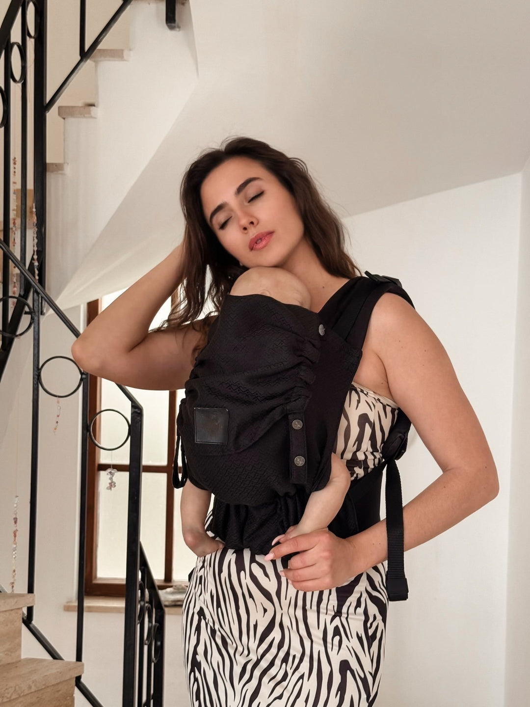 Kokadi Flip X är utrustad med ett steglöst justerbart kardborreband av slingtyg. Även bakdelen är gjord av diagonalt elastiskt slingtyg. Detta garanterar den ergonomiskt korrekta bärställningen, den så kallade Anhock-Spreiz-Haltung. Axelremmarna är gjorda av vadderat slingtyg och bärs korsvis: detta möjliggör optimal viktfördelning och bekvämt bärande även med bred rygg. Det jacquardvävda sjaltyget av 100% ekologisk bomull stödjer ditt barn säkert och pålitligt.