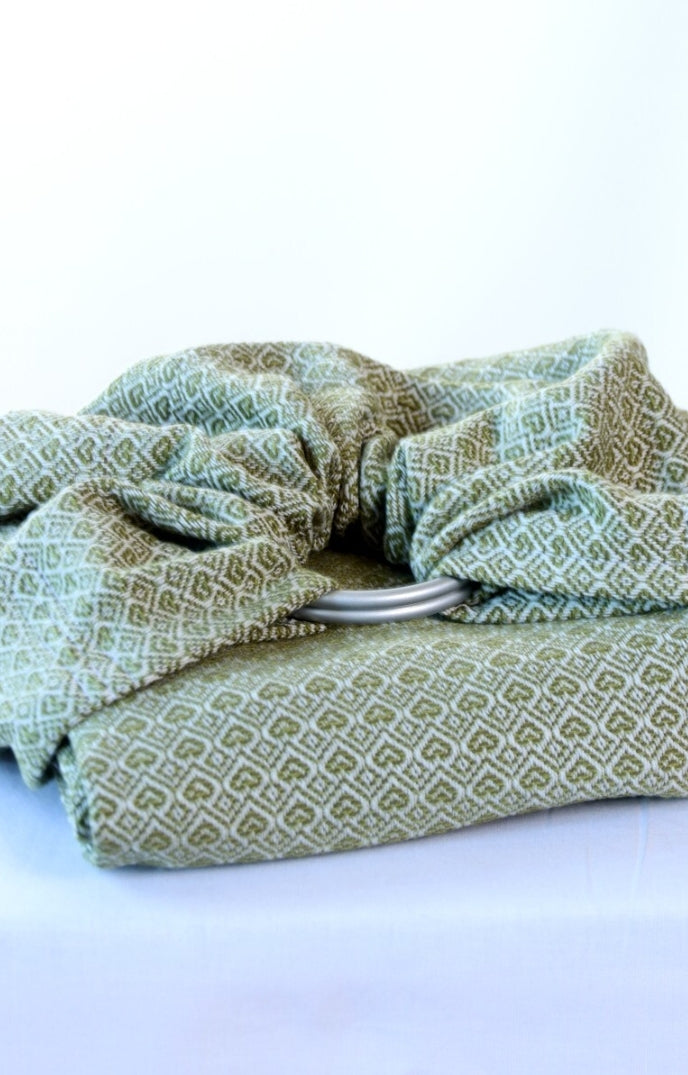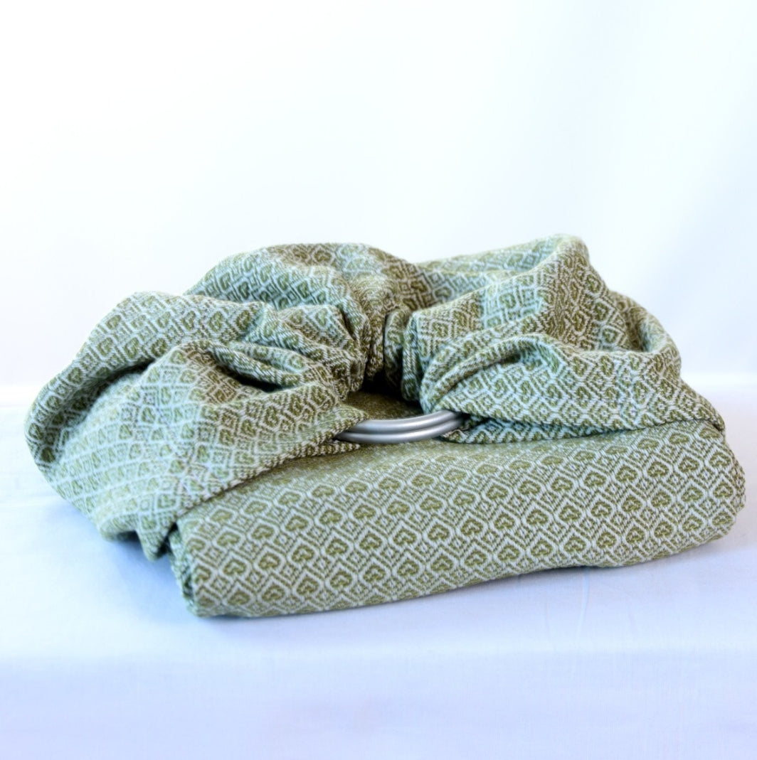 Ny Vanamo ringsjal, mjuk naturlig bomull. Oliv & lime grön och vit. Sött hjärtmönster. Medelvikt, mjuk och fluffig. Lämplig för bebisar i alla åldrar. Bra sjal för en nybörjare också! En illustrerad bruksanvisning kommer att medfölja (engelska).